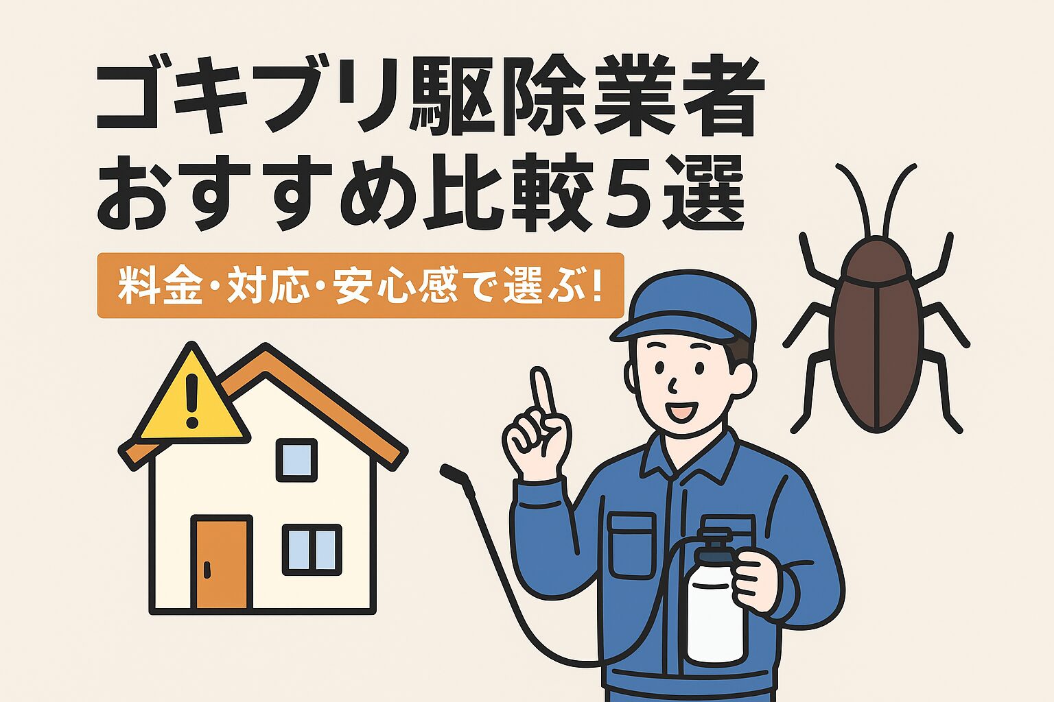 「どのゴキブリ駆除業者に頼めばいいの?」 突然のゴキブリ出現に困っているけれど、いざ業者を探そうとすると「料金が分かりにくい」「どこまで対応してくれるか不安」と悩んでしまう方は多いですよね。 本記事では、料金・サービス内容・対応エリア・口コミ評価など、重要な比較ポイントをもとに、2025年におすすめのゴキブリ駆除業者を5社厳選してご紹介します。 さらに、「価格重視」「徹底駆除したい」「とにかく早く来てほしい」など、目的別に自分に合った業者を見つける診断付きで解説しています。 まずは「無料見積もり」だけでも ...