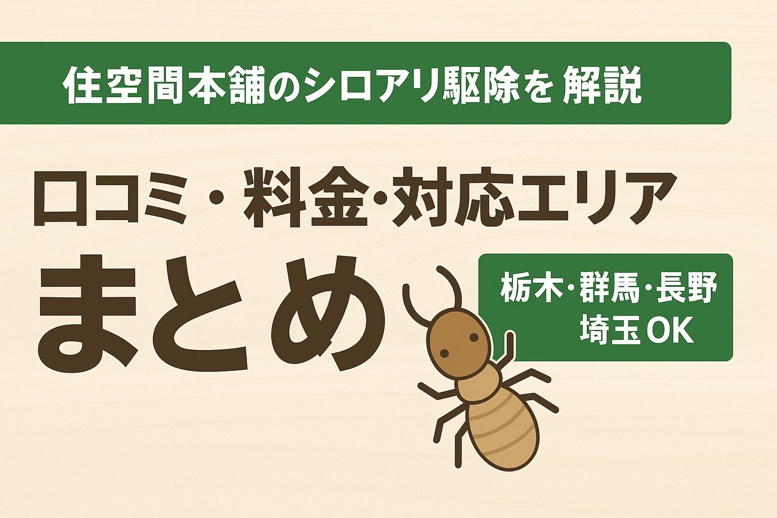 「床がきしむ」「羽アリを見かけた」など、少しでも異変を感じたら、それはシロアリ被害のサインかもしれません。 シロアリは一般的には九州・四国・西日本の沿岸部が最もリスクが高いとされています。 しかし栃木・群馬・長野・埼玉エリアは、いずれも関東~中部の内陸部で、梅雨時は湿気が多く、さらに古い木造住宅が多いため、シロアリ被害が発生しやすい地域といえます。 しかし、いざ駆除業者を探そうと思っても「料金は?」「本当に信頼できる?」と迷う方がほとんどです。 本記事では、地域密着型で高評価の「住空間本舗」について、料金 ...