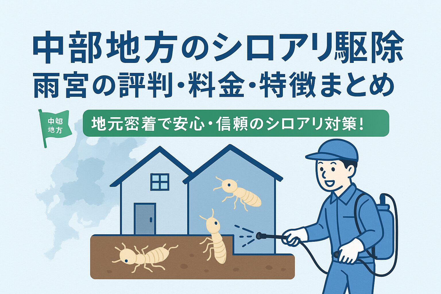 シロアリは静かに家をむしばみ、気づいたときには深刻な被害につながることも珍しくありません。 特に中部地方(愛知・岐阜・三重・静岡・長野)は湿気が多く、シロアリが発生しやすい環境のため、定期的な点検と早めの駆除が欠かせません。 「どこに頼めば安心できる?」と悩んでいる方には、愛知・岐阜・三重を中心に60年以上の実績を誇る『雨宮』がおすすめです。 国家資格者による確実な施工、最長5年の保証、年1回の無料点検など、充実したサービスが高く評価されています。 本記事では、雨宮の特徴、料金目安、実際の口コミ・評判、申 ...
