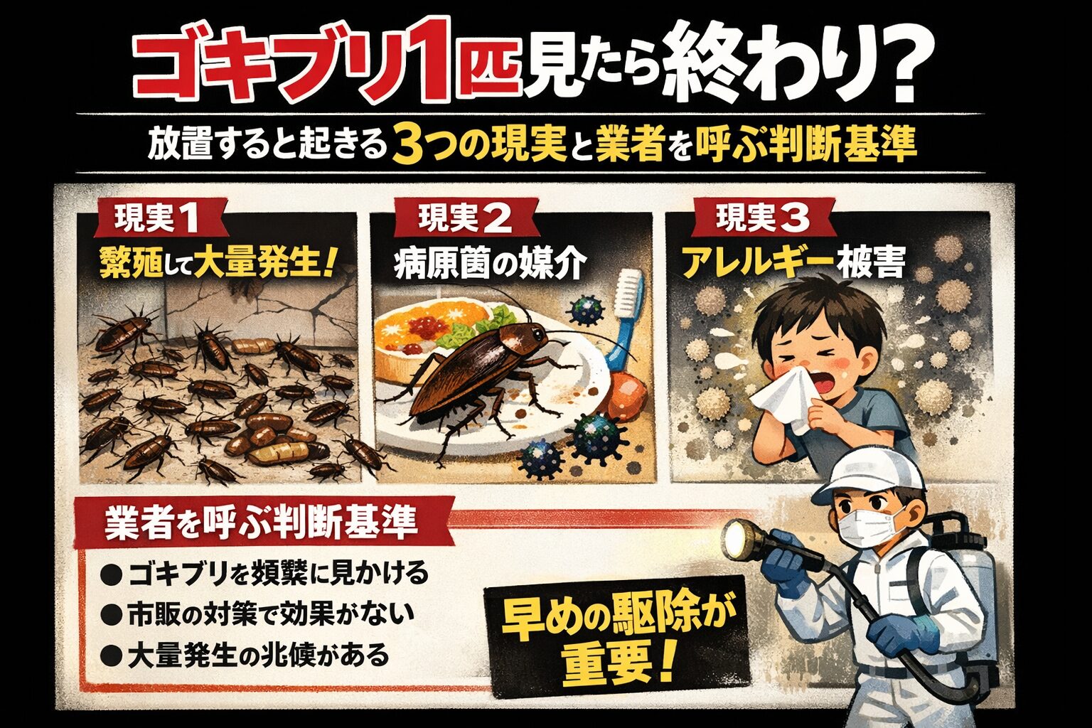 「1匹だけなら大丈夫!」と思いますよね。 「ゴキブリが1匹出ただけだし、たまたまだよね…」そう思っている方は、実はかなり多いです。 結論から言うと、条件次第では“もう手遅れ”の可能性もあります。 なぜなら、ゴキブリは 普段は人目につかない 夜行性で隠れるのが得意 見える=すでに数が増えているケースが多い という特徴を持っているからです。実際には「1匹見えた時点で、複数潜んでいるケースが多い」とも言われています。 この記事では、 ゴキブリ1匹が「たまたまではない」理由 放置すると起きる現実的なリスク 自分で ...